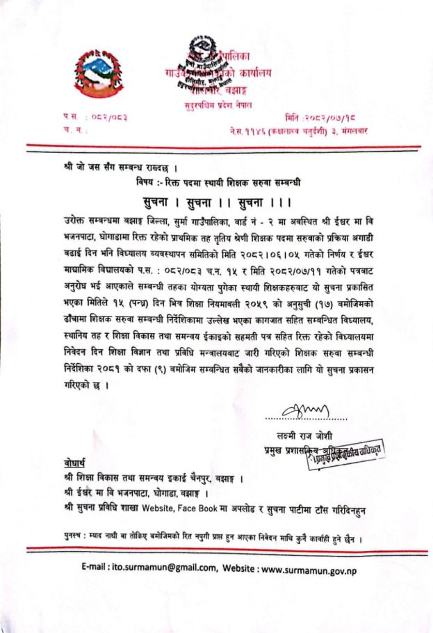रिक्त पदमा स्थायी शिक्षक सरुवा सम्बनधी सुचना ।